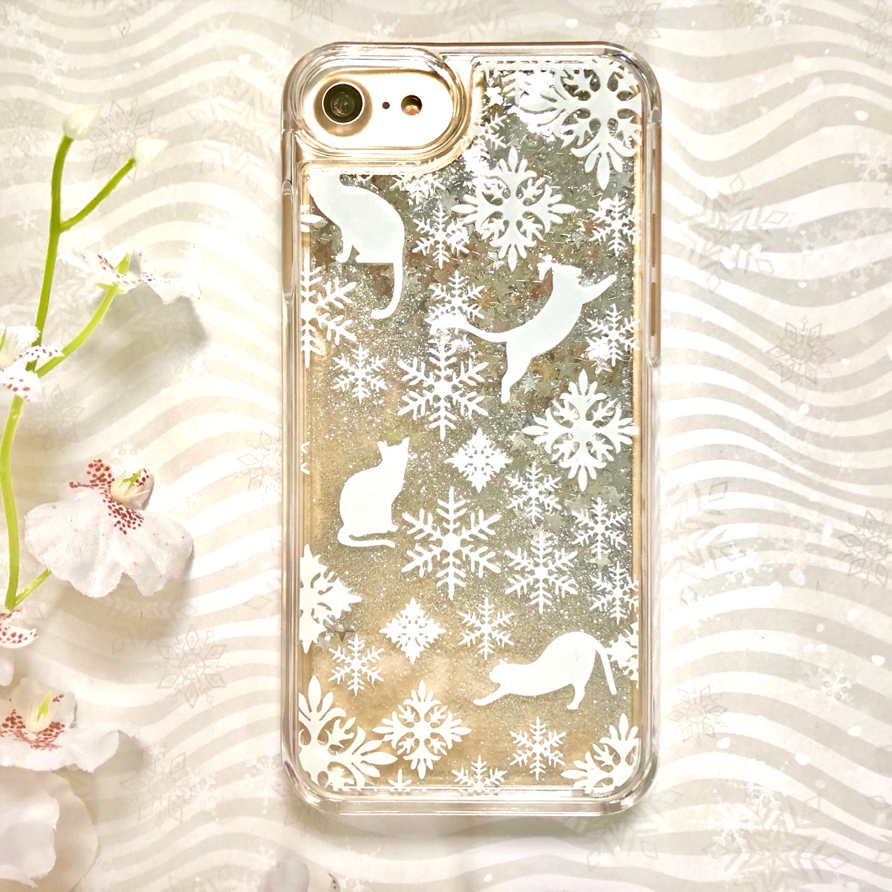 そこで、降る雪のイメージのキラキラ輝くグリッターが動くスマホケースをお作りしました。