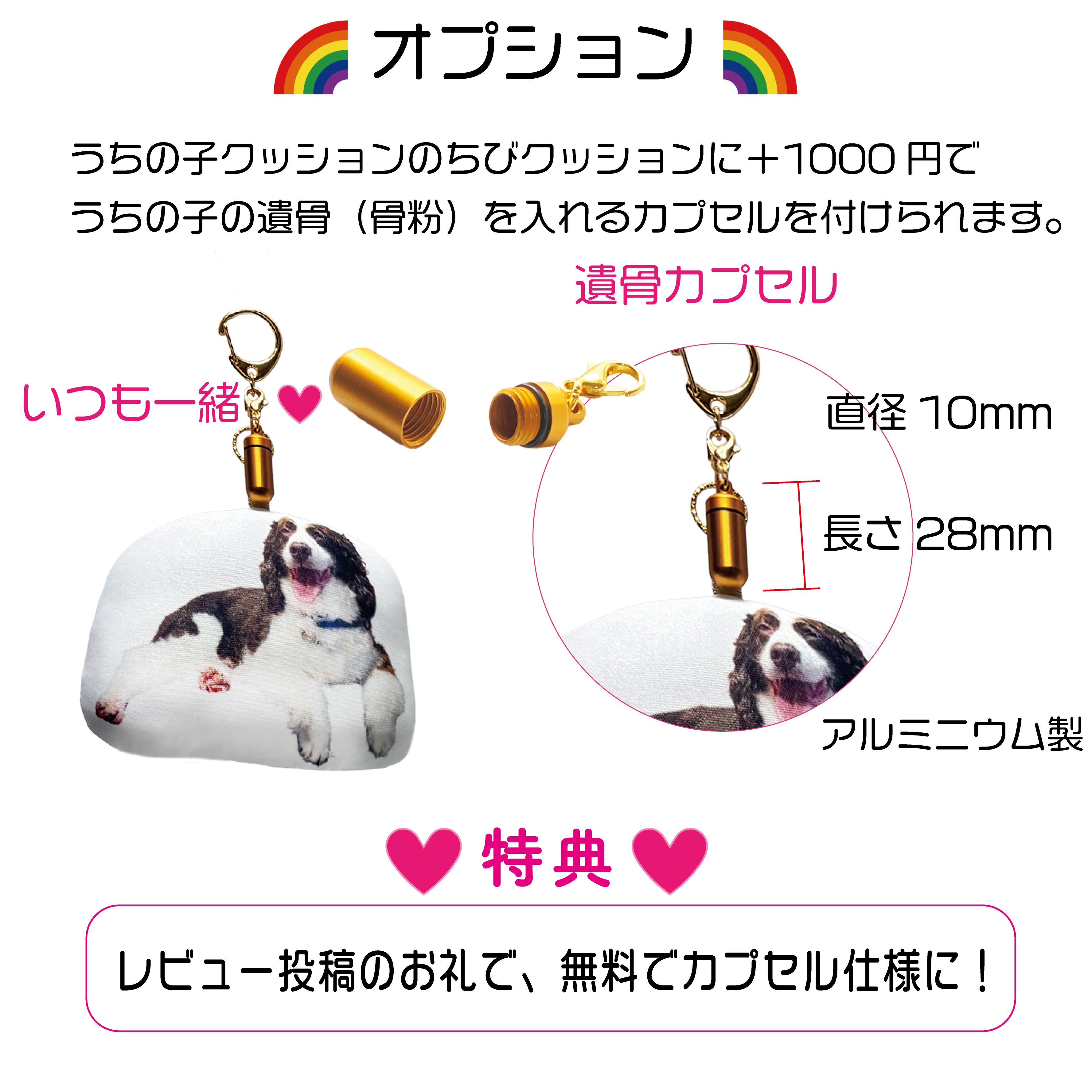 残念ながら虹の橋を渡ってしまった子のためには、+1000円でこのチビクッションを