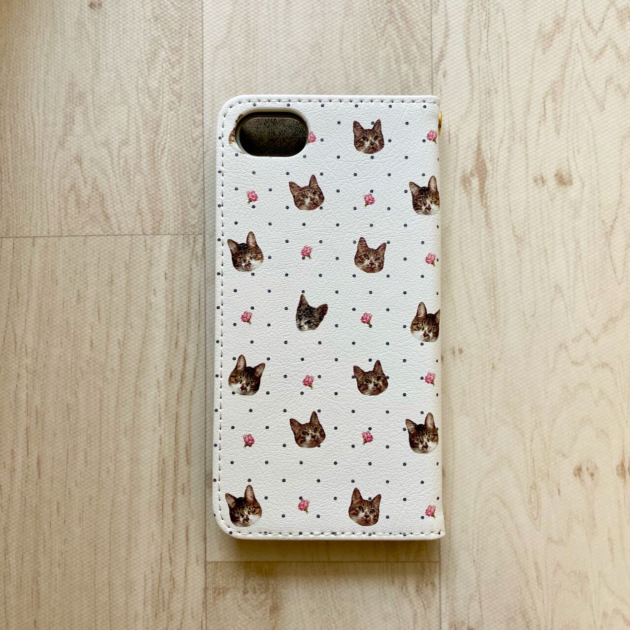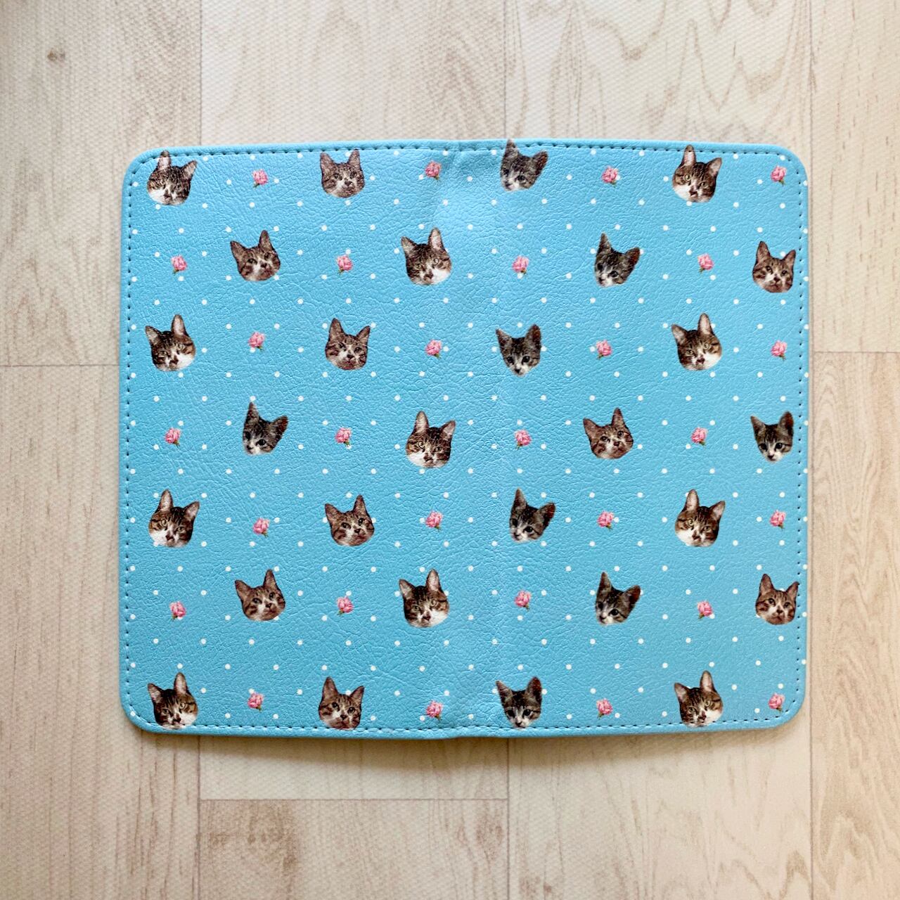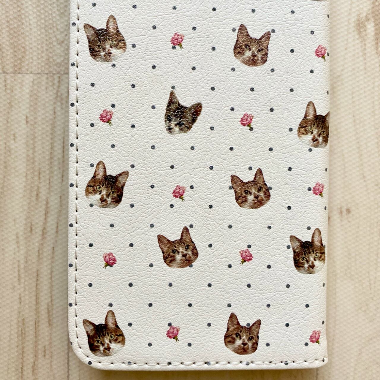 ドットとお花を散らした背景に可愛いうちの子の顔3種類をたくさん散りばめました。